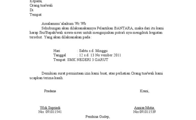 Daripada surat izin orang tua yang saya buat itu hanya disimpen di leptop saya doang, ada baiknya saya share juga di blog tutorial89.com ini. Untuk itu, anda bisa meminta orang tua menandatangi surat izin seperti contoh di. Bersamaan dengan datangnya surat ini, kami selaku orang tua dari anak tersebut mengetahui dan memberikan izin putra kami untuk mengikuti rentetan kegiatan bakti sosial yang diadakan oleh osis sman 1 malang. Surat izin orang tua adalah surat pernyataan bahwa orang tuawali dari seseorang memberikan izin atas suatu kegiatan yang akan dilakukan. Mennyangkut pentingnya kegiatan kali ini, kami mohon kepada bapak/ibu selaku orang tua/ wali murid untuk memberi izin putra putrinya untuk.